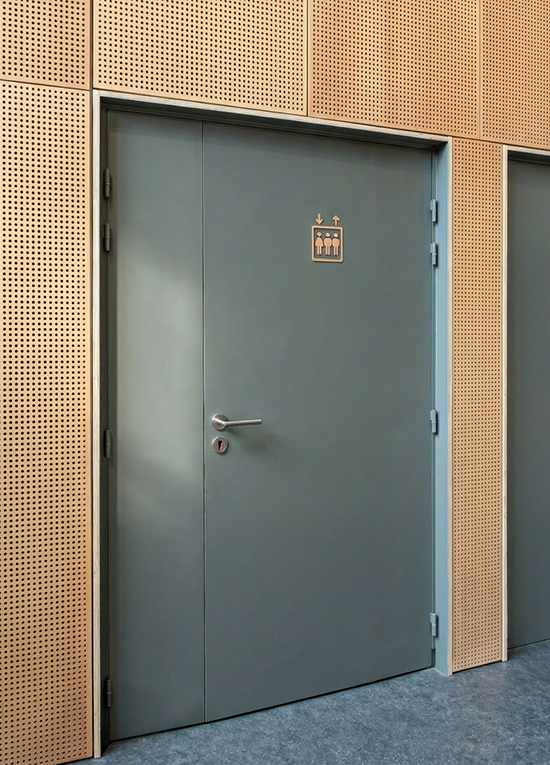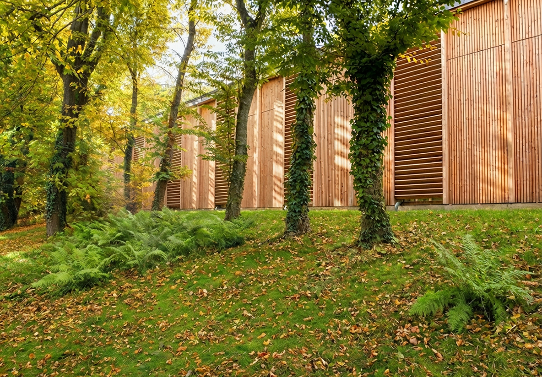 L’annexe du gymnase, toujours dans le souci de se fondre au mieux dans le décor arboré, sera, elle aussi, semi-enterrée et donc aménagée sur deux niveaux. Le volume inférieur, sous les arbres, sera couvert de bois brûlé. Seul le niveau supérieur émergera du talus gazonné.