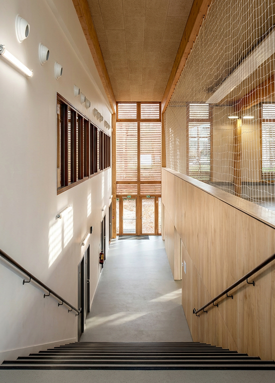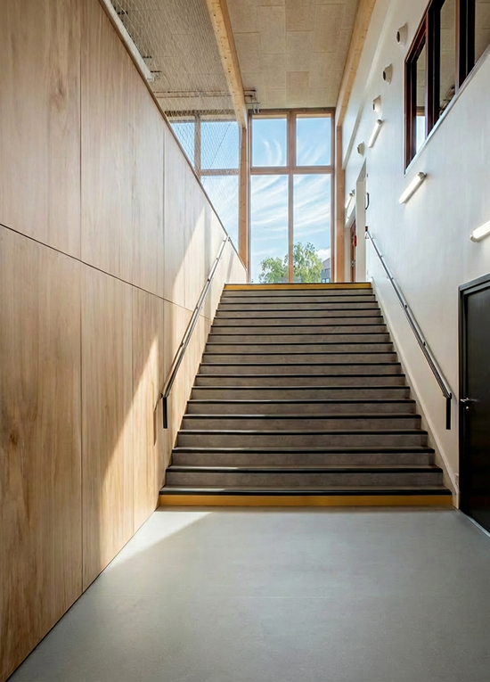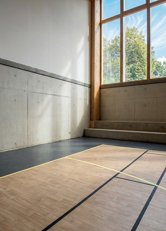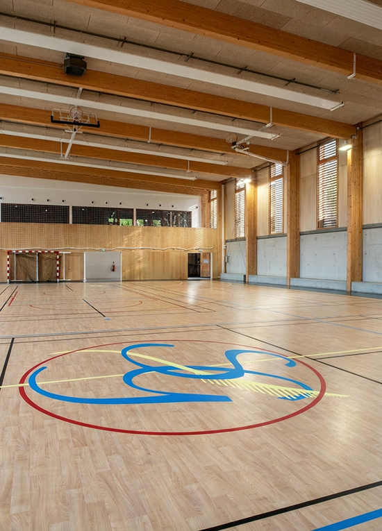 Le volume principal, un bâtiment en bois très lumineux qui accueillera le plateau multisports, est constitué de douze portiques en bois lamellé collé et d’un socle semi enterré en béton. Il n’émerge qu’à 6,50 mètres de haut, soit à un niveau plus bas que le gymnase historique, situé de l’autre côté du terrain de foot.