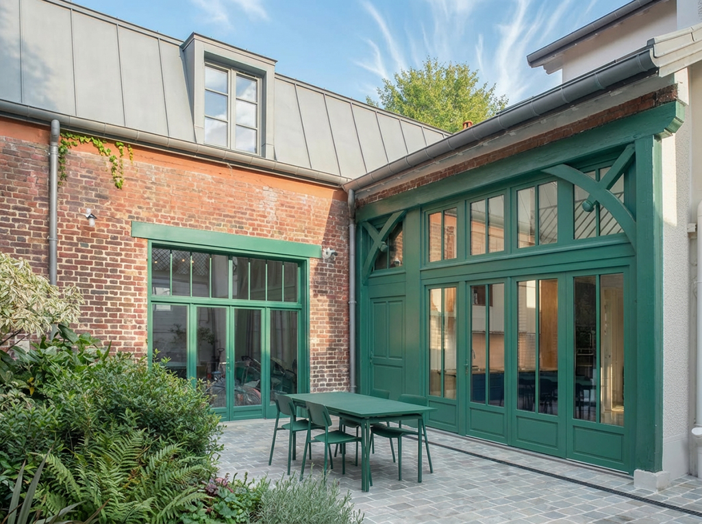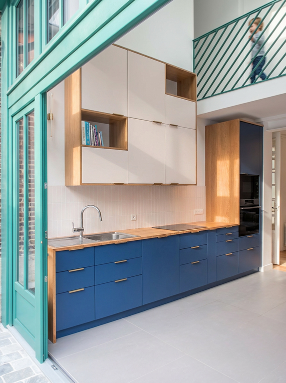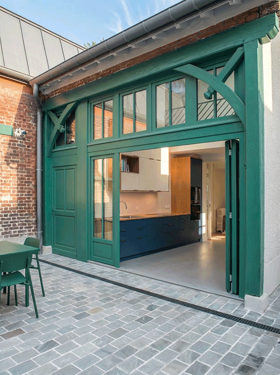 Le projet redéfinit les circulations par la création d’une véritable entrée et la connexion de l’ancien atelier à la maison principale par une passerelle au R+1. La cuisine, pensée comme un cœur de vie, s’ouvre en double hauteur sur la cour grâce à une grande porte accordéon en bois, reprenant la trame des ouvrants existants.