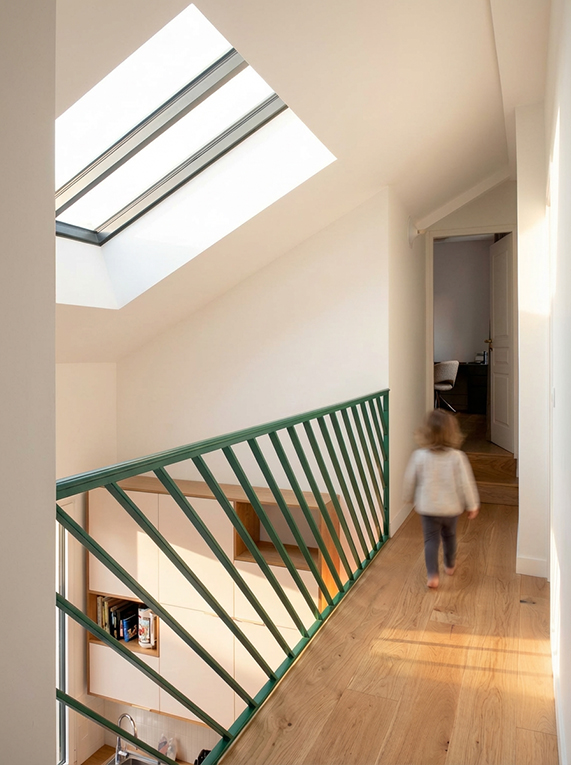 Soumis à des exigences patrimoniales fortes de la ville, le projet privilégie une approche respectueuse : conservation des volumes et des matériaux d’origine, reconstruction de la véranda à l’identique, et création d’une surélévation discrète. Habillée de zinc et ponctuée d’une lucarne, celle-ci accueille un vaste espace parental sous toiture.